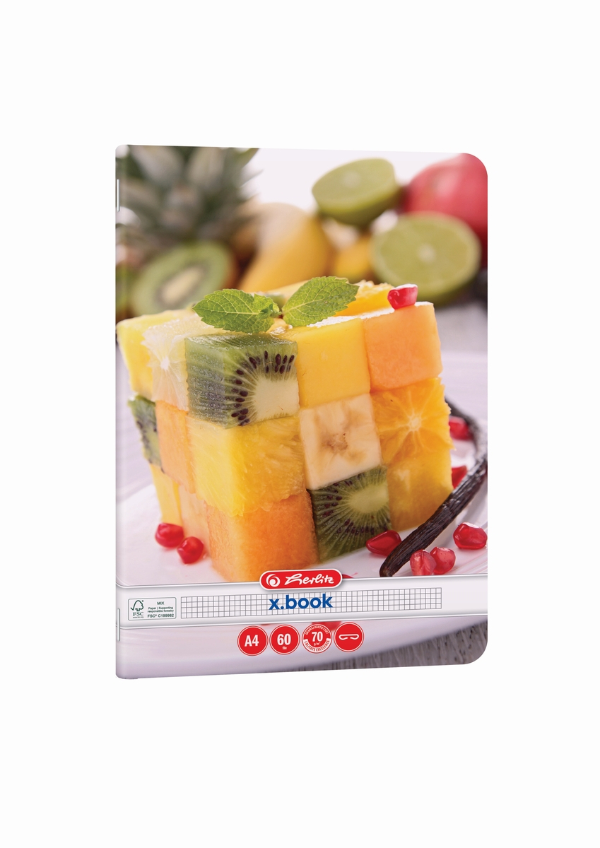 Caiet, format A4, coperti din carton dublu cretat, lucios, colturi rotunjite, hartie 70 g/mp, 60 file, patratele, capsat, motiv Healthy Snack.