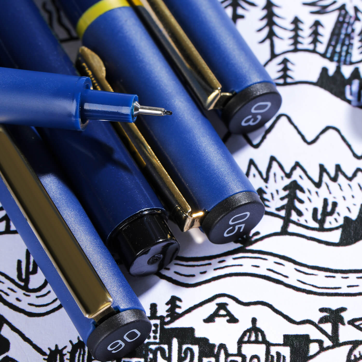 Recomandat pentru început: 0.3 mm pentru uz general și 0.6 mm pentru contururi. Pe măsură ce avansezi, vârfurile mai fine (0.05–0.2 mm) devin utile pentru detalii și hașuri.