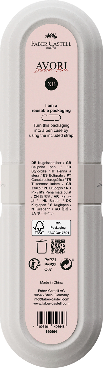 Pixul AVORI Inner Fire portocaliu Faber-Castell este confectionat din plastic reciclat 92%. Forma ergonomica, angulara, suprafete fatetate, sculptate meticulos. Mecanism actionat prin rotire. Mina albastra XB. Clip solid din metal. Ambalaj multifunctional din carton reciclat, care nu doar protejează pixul, ci poate fi reutilizat in multiple moduri. Cu un design inteligent, cutia se transforma usor intr-un suport pentru instrumente de scris.