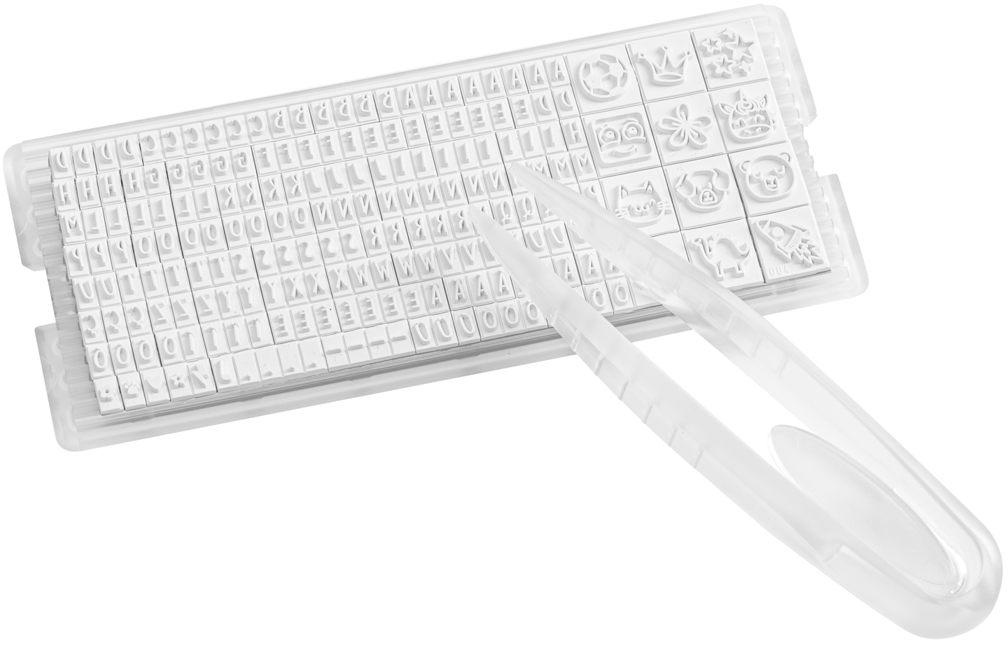 - Set complet de litere, cifre și simboluri + pensetă pentru aranjarea lor pe ștampilă